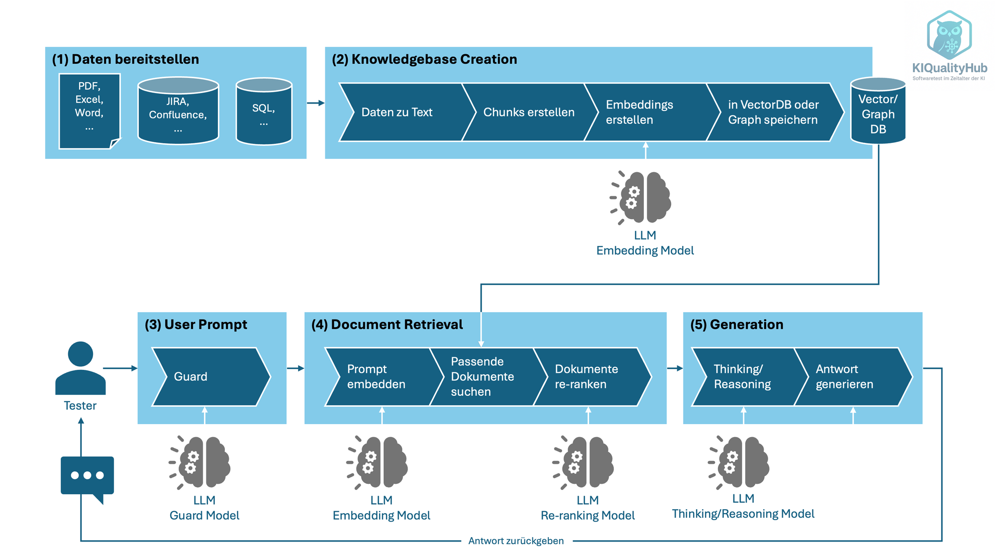 - Generation: LLM erzeugt Antworten basierend auf den abgerufenen Informationen